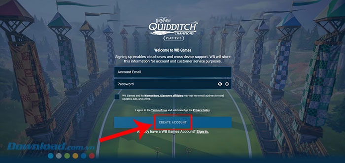 Bước 2: Mọi người sẽ được yêu cầu lập tài khoản WB Games bằng cách điền email, mật khẩu và nhấn Create Account. Nếu đã có tài khoản, người dùng chỉ cần nhấn vào Sign in để tiến hành đăng nhập.