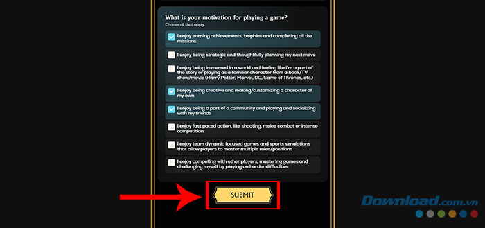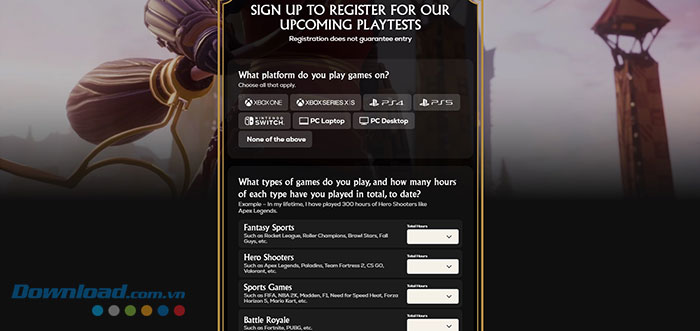 Bước 4: Hoàn thiện các thông tin được yêu cầu bao gồm nền tảng sẽ chơi game, loại trò chơi yêu thích và thời gian chơi, điều yêu thích khi chơi game.