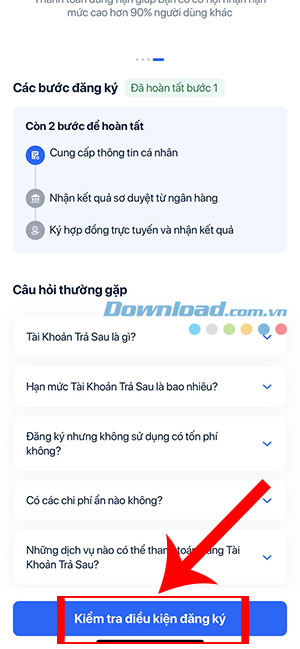 Bước 2: Tiếp tục nhấn vào Kiểm tra điều kiện đăng ký. Để hiểu thêm về Tài khoản trả sau của ZaloPay, mọi người có thể đọc phần Câu hỏi thường gặp.