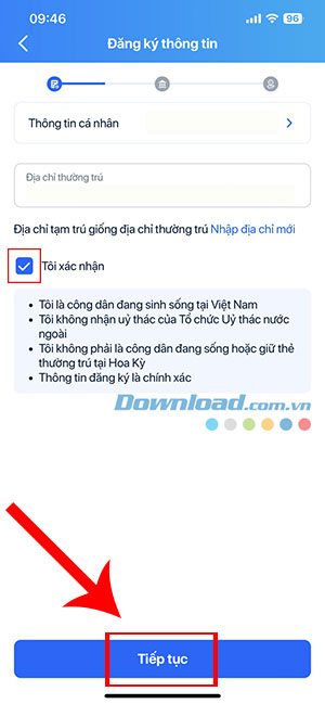 Bước 3: Kiểm tra lại thông tin cá nhân của mình, tích vào ô Tôi xác nhận và nhấn Tiếp tục.