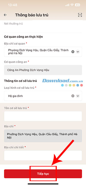 Bước 5: Ấn Tiếp tục để hoàn thành khai báo tạm vắng online trên VNeID.