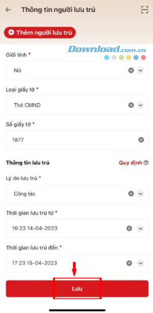 Bước 4: Tại trang Thông tin người lưu trú, nhấn vào Thêm người lưu trú. Hoàn thiện các thông tin về người lưu trú được yêu cầu. Cuối cùng, nhấn nút Lưu để gửi yêu cầu đăng ký tạm trú tới hệ thống.