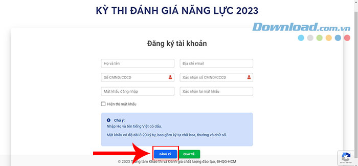 Bước 2: Điền đầy đủ và chính xác các thông tin được yêu cầu như Họ và tên, Địa chỉ email, Số CMND/CCCD và nhấn Đăng ký.
