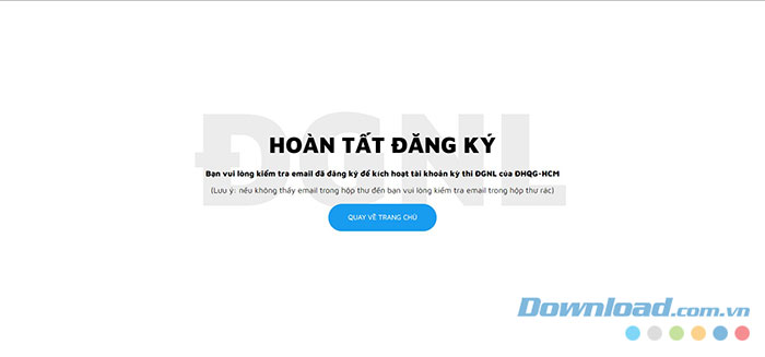 Bước 3: Một thông báo Hoàn tất đăng ký sẽ xuất hiện, thí sinh cần kiểm tra email đã đăng ký để kích hoạt tài khoản kỳ thi ĐGNL của ĐHQG TP.HCM.