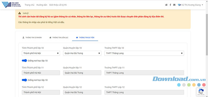 Bước 4: Mọi người sẽ được chuyển đến trang hoàn thiện Hồ sơ thí sinh. Thí sinh cần điền đầy đủ và chính xác các thông tin trong 3 tab, bao gồm: Thông tin cá nhân, Thông tin liên lạc và Thông tin ưu tiên.