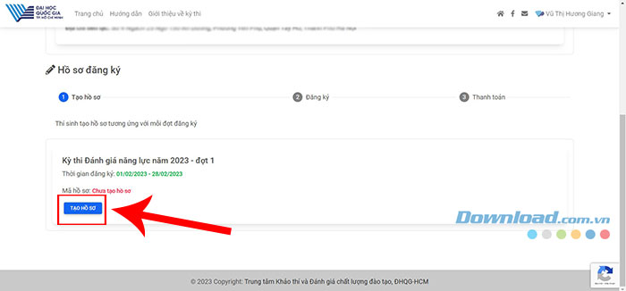 Bước 5: Sau khi hoàn tất hồ sơ, nhấn vào Trang chủ và chọn Tạo hồ sơ để bắt đầu đăng ký thi ĐGNL.