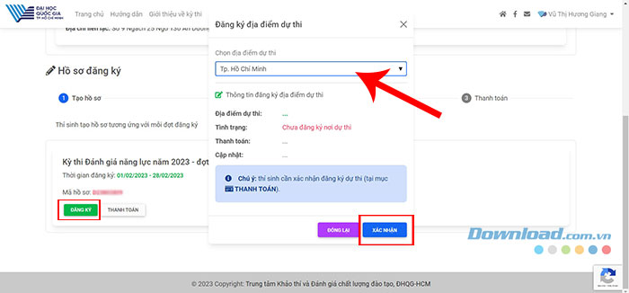 Bước 6: Lúc này, Mã hồ sơ của thí sinh sẽ xuất hiện. Tiếp tục nhấn vào Đăng ký và Chọn địa điểm dự thi. Sau đó, chọn Xác nhận để lưu thay đổi và Đóng lại.