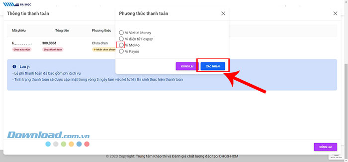 Thí sinh có thể nộp lệ phí thi qua các ví điện tử là Viettel Money, Foxpay, MoMo và Payoo. Sau khi chọn ví điện tử dùng để thanh toán, nhấn Xác nhận > Đóng lại.