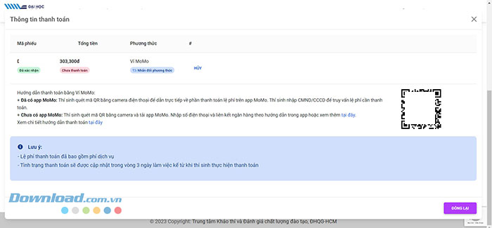 Bước 9: Một mã QR sẽ xuất hiện, thí sinh dùng camera điện thoại và quét mã QR để dẫn tới phần thanh toán lệ phí trên ứng dụng ví điện tử. Tình trạng thanh toán sẽ được cập nhật trong vòng 3 ngày làm việc kể từ khi thực hiện thanh toán.