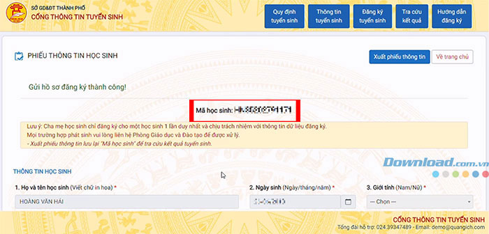 Bước 9: Lưu lại Mã học sinh tại trang Phiếu thông tin học sinh để tiến hành tra cứu khi có kết quả tuyển sinh vào lớp 6 công lập.
