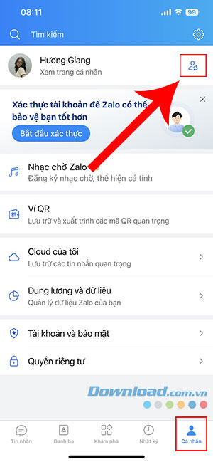 Bước 1: Mở ứng dụng Zalo trên thiết bị của mình, truy cập tab Cá nhân ở góc dưới cùng bên phải.