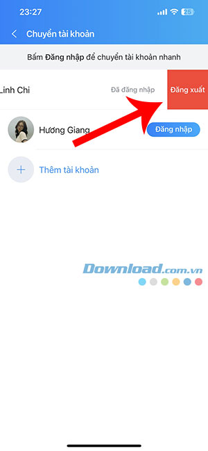 Bước 6: Để đăng xuất khỏi một tài khoản, truy cập trang Chuyển tài khoản bằng cách mở tab Cá nhân > chạm vào avatar tài khoản. Sau đó, vuốt sang trái và nhấn nút Đăng xuất.
