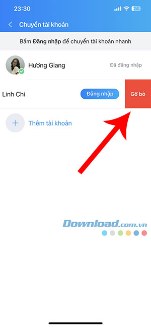 Để xóa tài khoản hoàn toàn khỏi Zalo, sau khi đăng xuất khỏi tài khoản đó, người dùng tiếp tục vuốt sang trái và nhấn Gỡ bỏ.