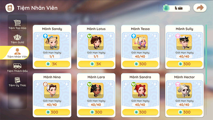 Ngoài ra, người chơi có thể mua mảnh nhân viên trong tiệm tạo hóa để khi đủ mạnh sẽ ghép thành một nhân viên hoàn chỉnh. Mỗi nhân viên vàng cấp cao nhất sẽ cần 40 mảnh để tạo ra 1 nhân viên, ghép nhân viên tím cần 20 mảnh và ghép nhân viên xanh cần 10 mảnh.