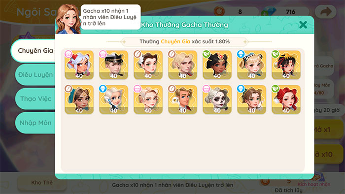 Để có những nhân viên đầu tiên cho cửa hàng cà phê, game thủ cần tuyển họ qua hệ thống gacha bằng cách dùng xu hoặc kim cương. Người chơi nên tuyển dụng 10 lần cùng lúc để tăng cơ hội nhân viên nhân viên chuyên nghiệp cấp cao, những người có khả năng tốt nhất trong việc hấp dẫn và phục vụ khách hàng.