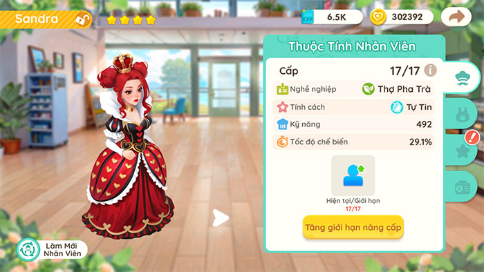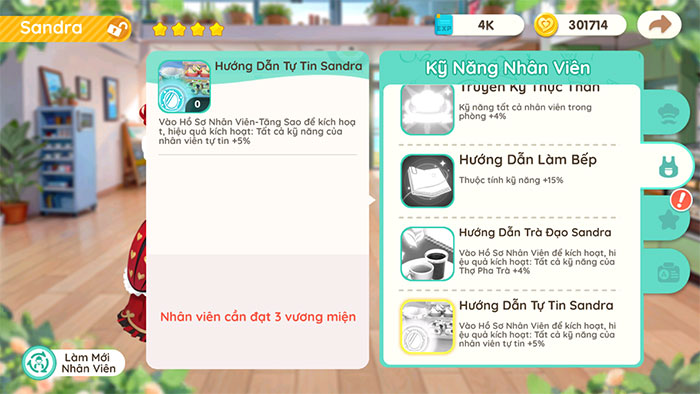 Mỗi nhân viên sẽ có nhiều kỹ năng kèm theo và phẩm chất càng cao thì càng sở hữu nhiều kỹ năng. Để mở khóa và tăng cấp kỹ năng, người chơi cần các nguyên liệu tương ứng để nâng sao và vương miện của nhân viên đó.