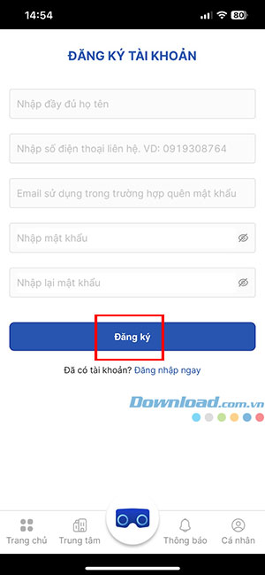Bước 3: Sau đó, hoàn thiện các thông tin cá nhân được yêu cầu, như họ tên, số điện thoại và mật khẩu. Nhấn nút Đăng ký để hoàn tất quá trình tạo tài khoản.