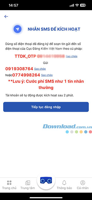 Ví dụ: TTDK_OTP 0914419xxx và gửi tới 1 trong 2 số điện thoại trên. Sau đó, tài khoản TTDK sẽ tự động kích hoạt sau 2 phút.