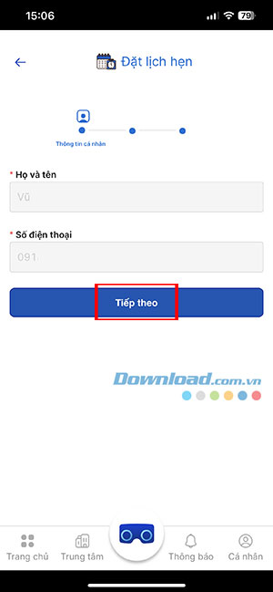 Bước 2: Tại trang Đặt lịch hẹn, xác nhận họ tên và số điện thoại, sau đó nhấn Tiếp theo.