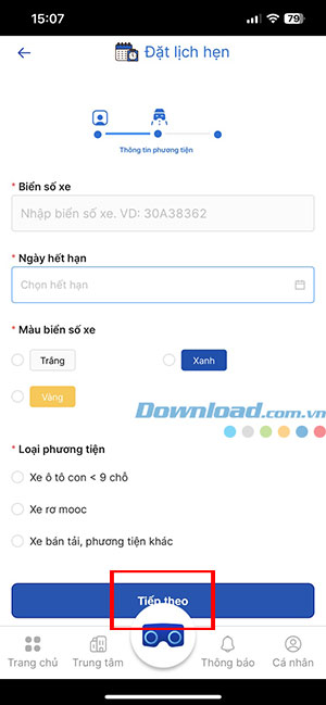 Bước 3: Hoàn thiện thông tin phương tiện của mình bao gồm: Biển số xe, Ngày hết hạn, Màu biển số xe, Loại phương tiện. Sau khi điền đầy đủ và chính xác thông tin, nhấn Tiếp theo.