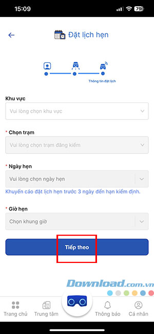Bước 4: Chọn Khu vực tới đăng kiểm, Chọn trạm và Ngày giờ hẹn đăng kiểm và nhấn nút Tiếp theo để hoàn thành đặt lịch đăng kiểm online. Ứng dụng khuyến cáo chủ phương tiện đặt lịch hẹn trước 3 ngày đến hạn kiểm định.