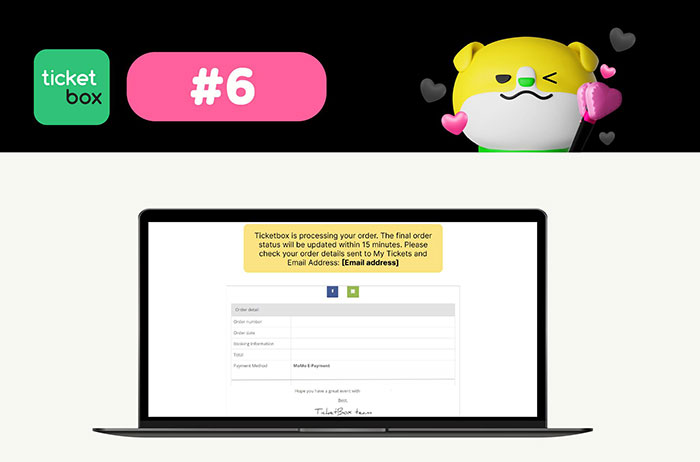 Bước 6: Sau khi thực hiện thanh toán thành công, hệ thống sẽ xử lý đơn hàng trong 15 phút. Người mua có thể kiểm tra vé của mình thông qua email và mục Vé đã mua.