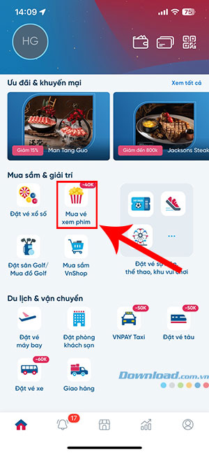 Bước 1: Truy cập ứng dụng Vietinbank iPay và tiến hành đăng nhập vào tài khoản. Sau đó, điều hướng tới Mua vé xem phim trong danh mục Mua sắm & giải trí.