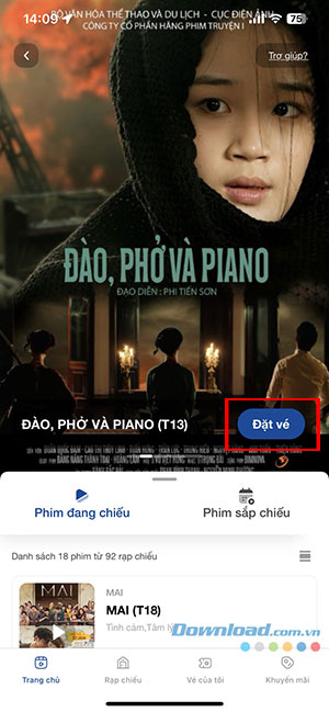 Bước 2: Tại trang mua vé xem phim, nhấn vào Đặt vé trong banner Đào, phở và piano (T13).