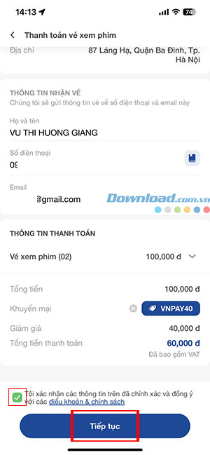 Bước 5: Tích vào ô vuông để đồng ý với điều khoản và chính sách, ấn nút Tiếp tục và tiến hành thanh toán để hoàn tất đặt vé xem phim.