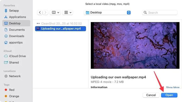 Bước 3: Bây giờ hãy điều hướng đến tệp video và tải nó lên. Ứng dụng sẽ tự động áp dụng video đó làm hình nền máy tính Mac.