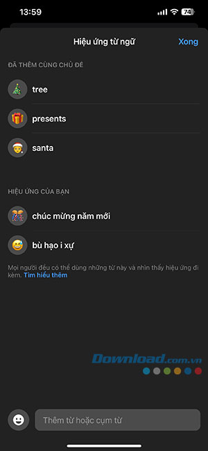 Đi kèm với chủ đề Giáng Sinh đẹp mắt cho giao diện cuộc trò chuyện, Messenger còn mang đến 3 hiệu ứng từ ngữ mới cùng chủ để. Mọi người có thể tham khảo Cách sử dụng Hiệu ứng từ ngữ trong Facebook Messenger để biết cách tự thiết lập hiệu ứng từ ngữ của riêng mình.