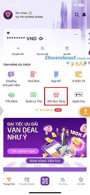 Bước 1: Mở ứng dụng TPBank Mobile và đăng nhập vào tài khoản. Sau đó, chọn Đổi quà tặng từ trang chủ.