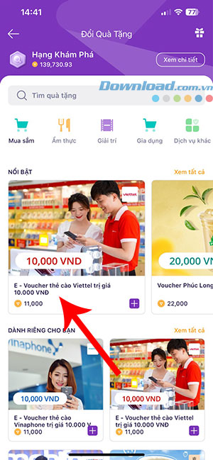 Bước 2: Tại giao diện danh mục các quà tặng, nhấn chọn một quà tặng mà mọi người muốn dùng điểm để quy đổi. TPBank cung cấp đa dạng quà từ nhiều dịch vụ như Mua sắm, Ẩm thực, Gia dụng,... để người dùng lựa chọn.