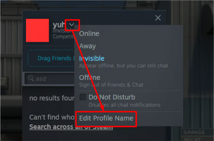 Bước 2: Tiếp theo, nhấp vào mũi tên hướng xuống bên cạnh biệt hiệu Steam để hiển thị tùy chọn Edit Profile Name.