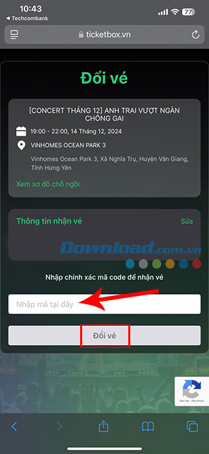 Bước 4: Mọi người sẽ được điều hướng tới trang Đổi vé của TicketBox. Kiểm tra Thông tin nhận vé gồm tên, số điện thoại và email để đảm bảo nhận được vé điện tử. Nhập hoặc dán mã quy đổi vé trong ví voucher vào ô Nhập mã tại đây. Sau đó, nhấn nút Đổi vé.