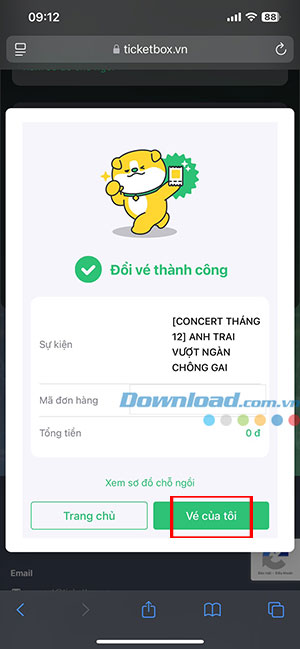 Bước 5: Thông báo đổi vé thành công sẽ xuất hiện. Nhấn nút Vé của tôi, truy cập mục Vé của tôi trên ứng dụng Ticketbox hoặc kiểm tra email để xem vé concert đã quy đổi.