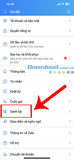 Bước 3: Trong menu Cài đặt, nhấn vào Danh bạ.