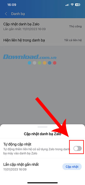 Bước 6: Nhấn nút Cập nhật để cập nhật, đồng bộ hóa danh bạ điện thoại hiện tại lên Zalo.