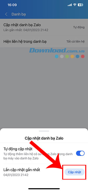 Bước 4: Chọn Cập nhật danh bạ Zalo.
