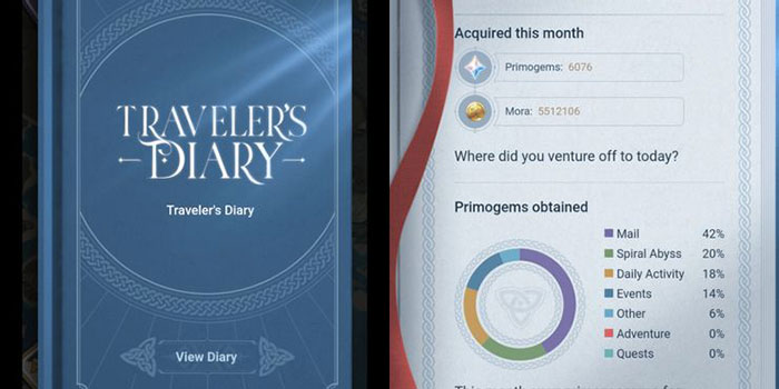 Traveler's Diary là một trong những công cụ mới nhất trong HoYoLAB. Cuốn sách này lưu giữ hồ sơ về thu nhập Primogems và Mora của người chơi (trong ba tháng gần nhất). Bằng cách nhìn vào nó, người chơi có thể theo dõi đơn vị tiền tệ của mình dễ dàng hơn. Công cụ này sẽ không xem xét đơn vị tiền tệ thu được thông qua nạp tiền hoặc giải thưởng từ sự kiện, vì vậy người chơi có thể dựa vào đó để dự đoán số Primogems hàng tháng mà mình có thể kiếm được từ trò chơi.