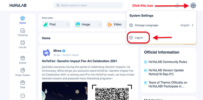 Để nhận phần thưởng đăng nhập hàng ngày, hãy điều hướng tới trang web HoYoLAB, sau đó nhấn vào biểu tượng avatar ở trên cùng bên phải của giao diện. Tiếp theo, nhấp vào Log in, điền thông tin tài khoản để tiến hành đăng nhập.