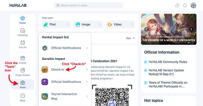 Mọi người sẽ thấy một nút Tools trên thanh công cụ bên phải. Nhấn vào đó để nhận phần thưởng đăng nhập HoYoLAB hàng ngày.
