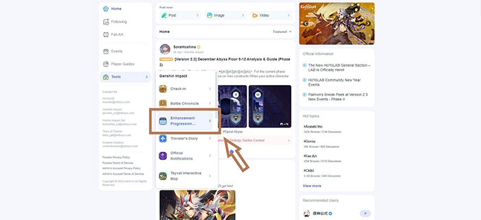 Công cụ gần đây nhất được phát hành trong HoYoLAB là Enhancement Progression Calculator. Công cụ này cực kỳ tiện dụng để quản lý tài nguyên. Để sử dụng nó, người chơi chỉ cần chèn nhân vật mong muốn và cấp độ của họ. Sau đó, máy tính sẽ hiển thị người chơi biết sẽ cần bao nhiêu tài nguyên để nâng cấp nhân vật.