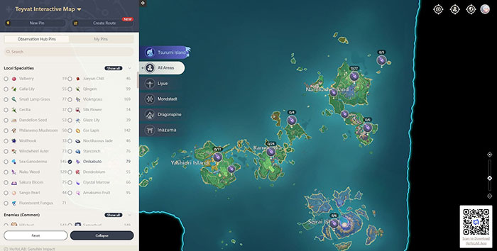 Hầu hết mọi thứ trong Genshin Impact đều được đánh dấu trên bản đồ tương tác từ kẻ thù, vật liệu, câu đố và thậm chí cả những bí ẩn easter egg. Ngoài ra, danh sách có thể được lọc theo từng quốc gia: Mondstadt, Liyue, Dragonspine, Inazuma.