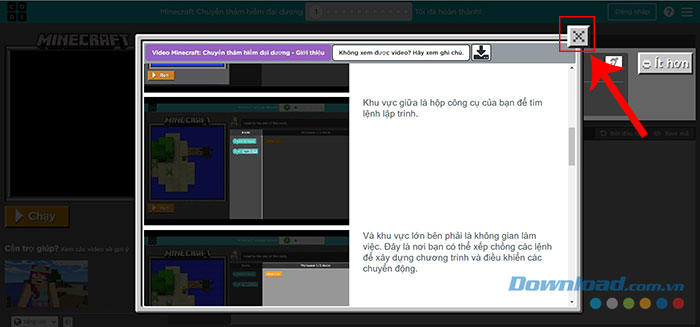Bước 3: Người dùng sẽ được chuyển hướng đến trang học lập trình cùng với một video và ghi chú hướng dẫn các thao tác cơ bản. Nhấn X ở góc bên phải để đóng vào bắt đầu lập trình với mã lệnh.