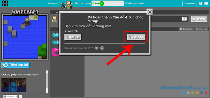 Mọi người có thể chơi lại cấp độ vừa vượt qua hoặc tiếp tục level mới cho tới khi hoàn thành toàn bộ một khóa học với Minecraft và chuyển sang khóa học mới với các thao tác tương tự.