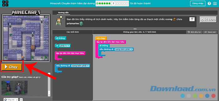 Bước 6: Kéo các khối lệnh từ hộp công cụ và thả vào không gian làm việc, xếp chồng chúng để tạo chuyển động tương ứng cho nhân vật. Khi đã sắp xếp các khối lệnh, mọi người có thể nhấn nút Chạy để lệnh được thực thi.