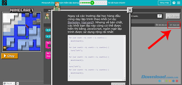 Mọi người cũng có thể xem các khối lệnh dưới dạng ngôn ngữ lập trình JavaScript bằng cách nhấn vào Xem mã.