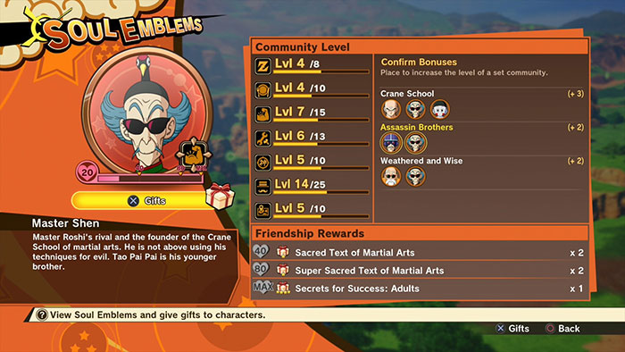 Mặc dù hoàn thành nhiệm vụ phụ hoặc nhiệm vụ lấy đồ cho NPC, như nhiệm vụ lấy thịt thỏ đông lạnh, có thể khiến cấp độ tăng, nhưng tặng quà cho các thành viên cộng đồng sẽ giúp tăng cấp nhanh chóng. Việc tăng cấp cho NPC sẽ tăng tiền thưởng và kỹ năng mà Goku nhận được khi được liên kết với một NPC nhất định, giúp tăng đáng kể khả năng chiến đấu của anh ta. Việc tặng quà có thể hơi khó khăn, vì nó ẩn bên trong một vài menu.