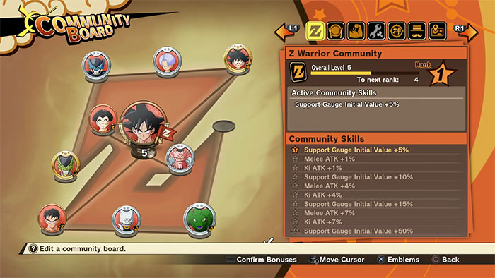 Có hàng chục NPC từ vũ trụ Dragon Ball trong thế giới bán mở của Dragon Ball Z: Kakarot. Những nhân vật này được đại diện trong Community Board và menu Soul Emblems. Bằng cách thiết lập liên kết với các thành viên cộng đồng, Goku có thể nhận được buff và tăng cường một số kỹ năng và khả năng nhất định trong khi một số NPC nhất định được liên kết với anh ta.